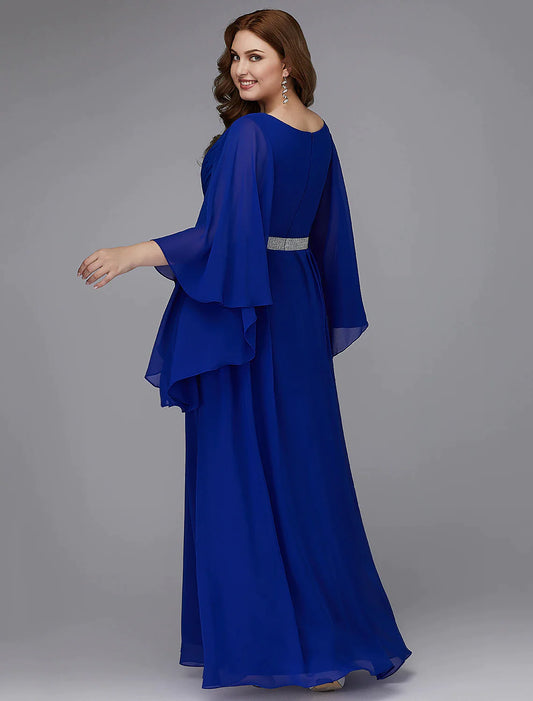 A-Line Plus Size Dress Wedding Guest Floor Length Long Sleeve V Neck Chiffon Lace-up with Crystals Sequin