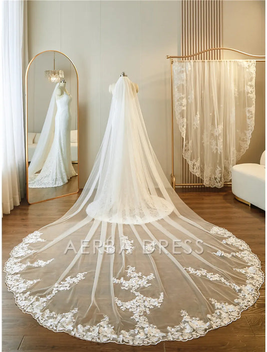 Aerba Dress High Quality One-tier Lace Applique Edge Wedding Veil Cathedral Veils Embroidery Appliques / Paillette 137.8 in (350cm) Gorgeous Tulle Veil