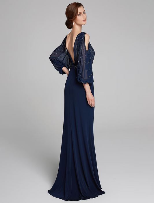 Mother of the Bride Dress Sparkle Shine Boat Neck Floor Length Chiffon Jersey Long Sleeve No with Beading Ruching