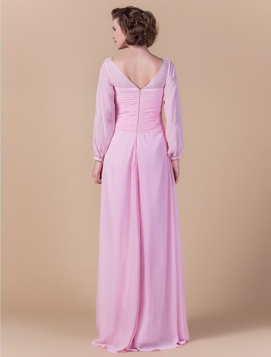 A-Line Mother of the Bride Dress Elegant V Neck Floor Length Chiffon Lace Sleeve with Pleats Appliques