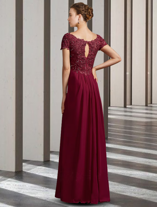 Mother of the Bride Dress Elegant V Neck Floor Length Chiffon Lace Short Sleeve with Appliques