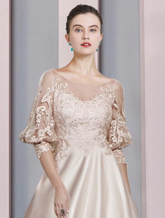 A-Line Mother of the Bride Dress Formal Wedding Guest Party Elegant Scoop Neck Satin Lace Half Sleeve with Crystal Brooch