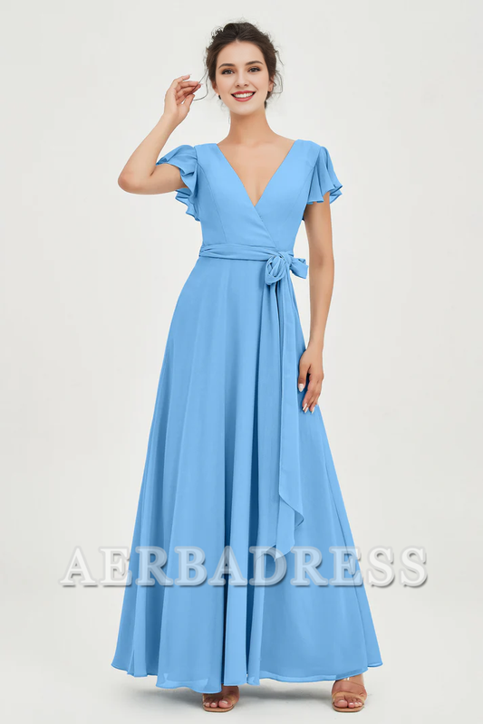 Aerba Dress Bridesmaid Dresses Chiffon A-Line V-neck Flutter Sleeves Pleated Lace up Floor-Length Elegant Simple Dresse Wedding Guest Dresses