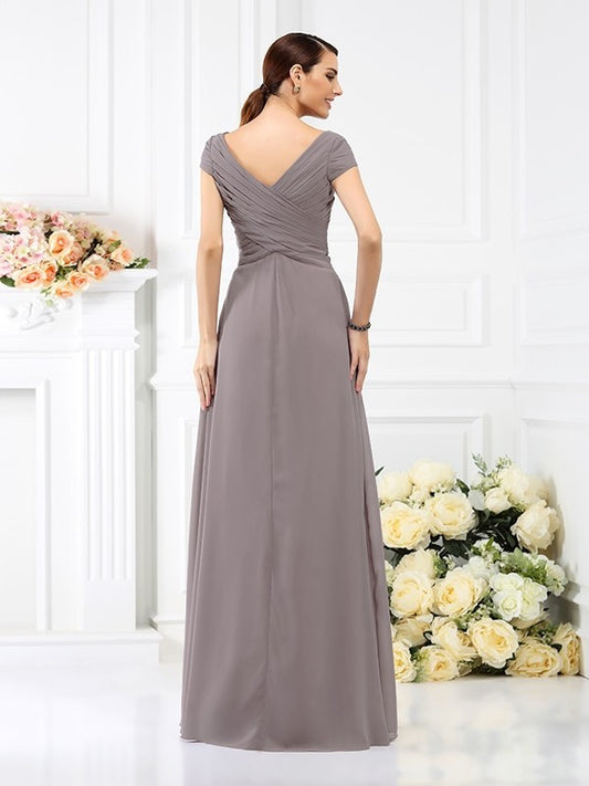 A-Line/Princess V-neck Pleats Short Sleeves Long Chiffon Bridesmaid Dresses