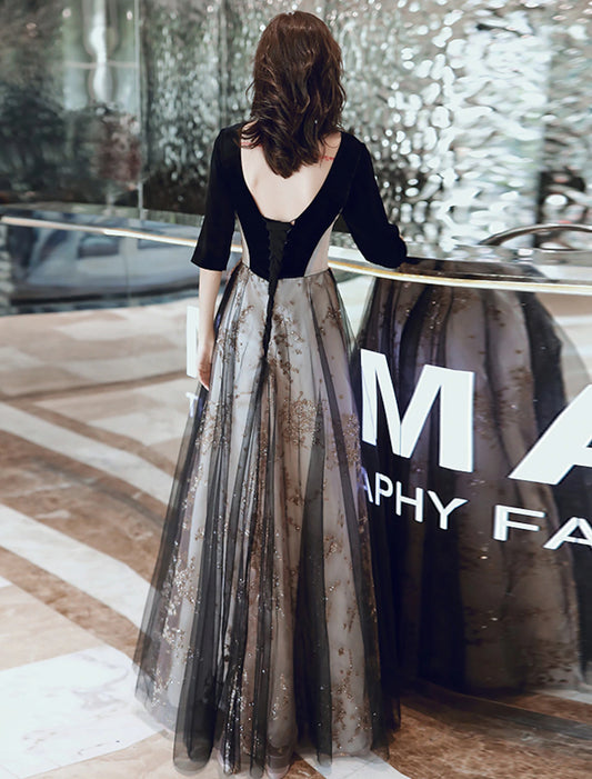 A-Line Glittering Cut Out Party Wear Formal Evening Dress Illusion Neck Half Sleeve Floor Length Velvet with Sequin Appliques