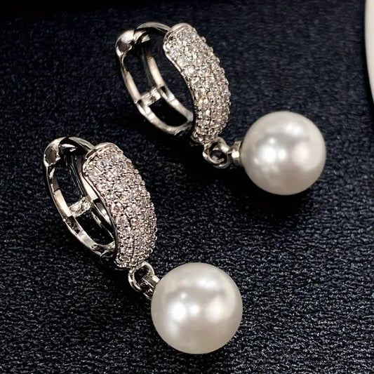 Aerba 1 Pair Vintage Elegance Freshwater Pearl Drop Earrings, 925 Silver Plated Zirconia Ear Jewelry, Unisex Romantic Wedding Bridal Accessory, Party Style, 0.47in Pearls with 0.51in Hoop