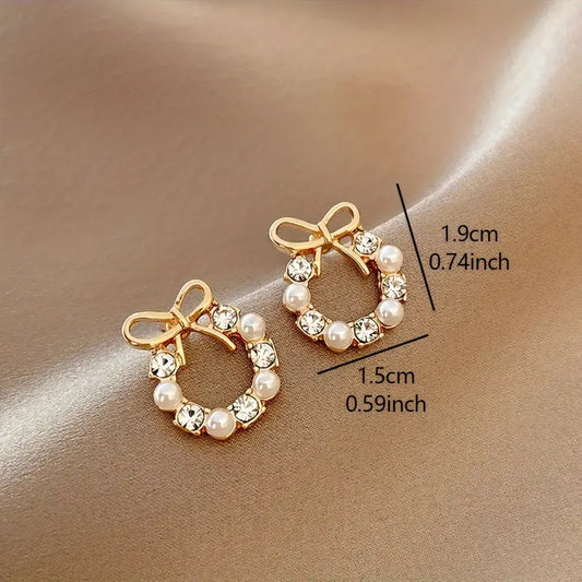 Aerba Tiny Delicate Round Stud Earrings With Bow Imitation Pearl Design Zinc Alloy Jewelry Elegant Simple Style For Women Daily Wear