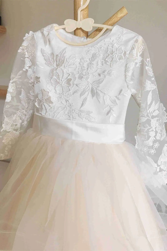 Wedding Flower Girl Dress A Line Crew Neck Long Sleeves with Appliques Layering Ruched Elegant Girl Communion Formal Dress Princess Dress