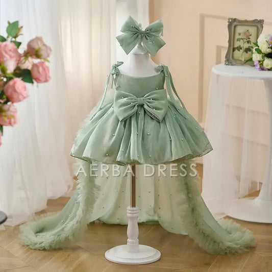 Wedding Flower Girl Dress Fantastic A Line Spaghetti Strap Beadwork Bow Sweep Train Girl Communion Formal Dress One-Year-Old Birthday Party Dress Cute Girl Princess Dress