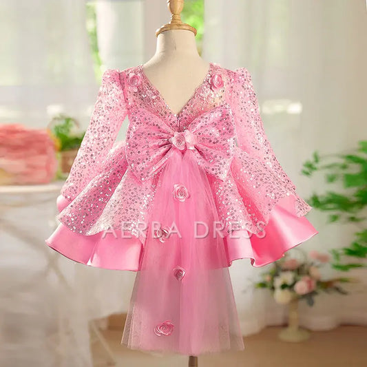 Wedding Flower Girl Dress Sequin A Line Round Neck Long sleeves Tiers Sparkle Girl Communion Formal Dress One-Year-Old Birthday Party Dress Cute Girl Princess Dress