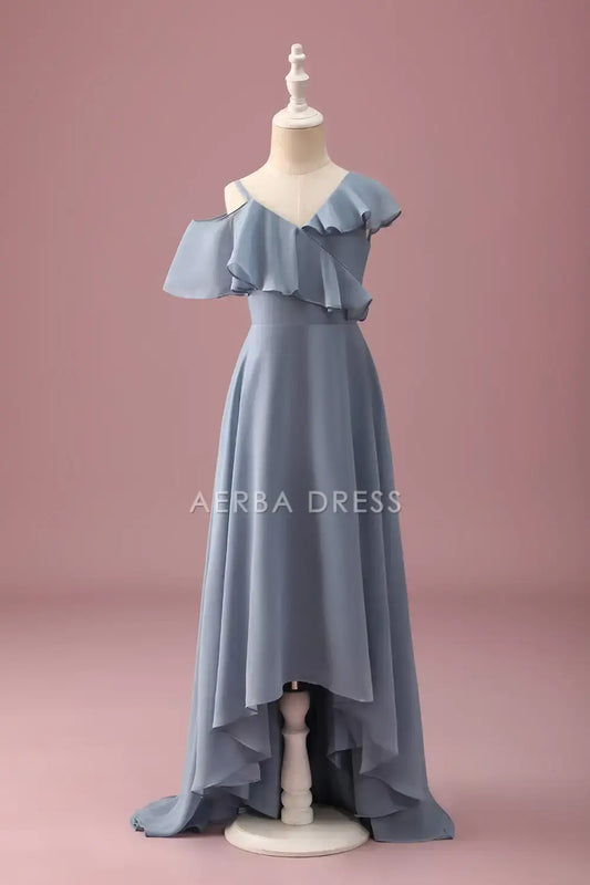 Junior Bridesmaid Dress A Line V Neck High-Low With Ruffles Fashion Long Girl Formal Dress