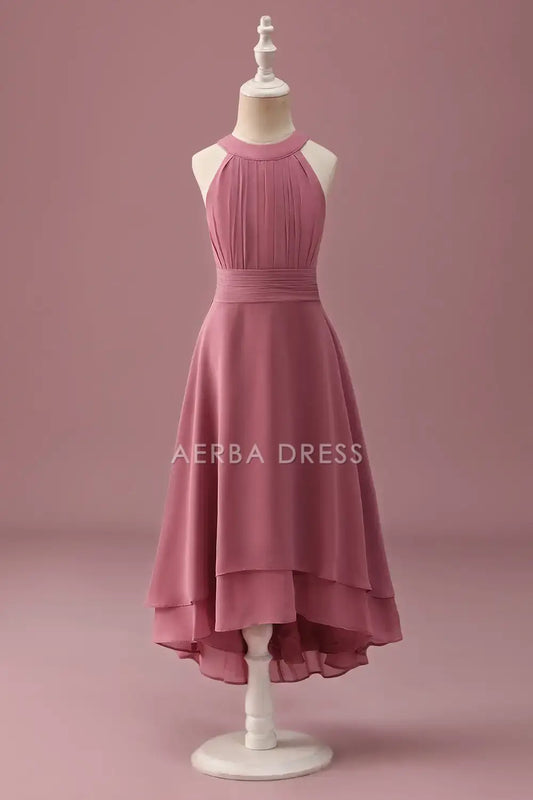 Junior Bridesmaid Dress A Line Halter Sleeveless Pleated High Low Double-Layer Hemline Long Fashion Girl Formal Dress