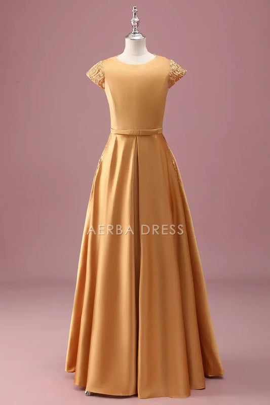 Junior Bridesmaid Dress A Line Round Neck Short Sleeves Lace Exquisite Long Girl Formal Dress