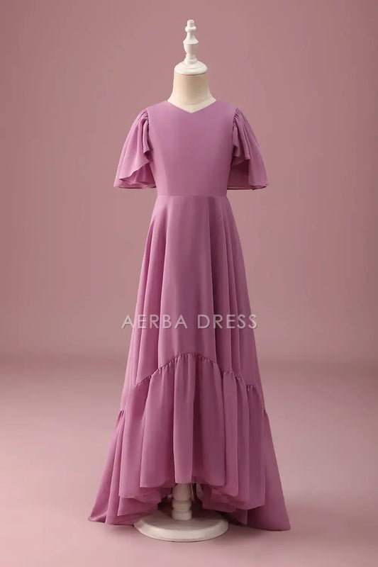 Junior Bridesmaid Dress A-Line V Neck Flowy Sleeve Ruched High-Low Fashion Long Girl Formal Dress