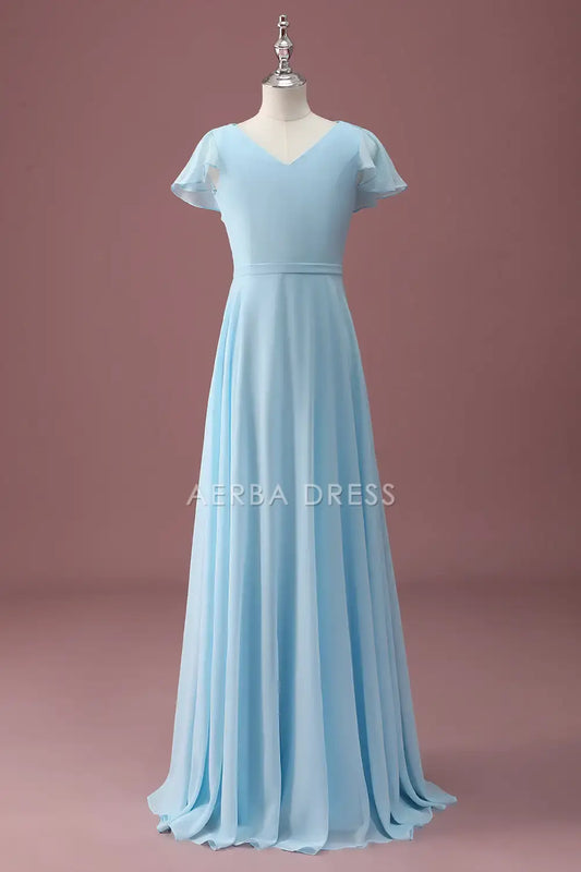 Junior Bridesmaid Dress A Line V-Neck Flowy Sleeve Backless Ruched Fantastic Long Girl Formal Dress