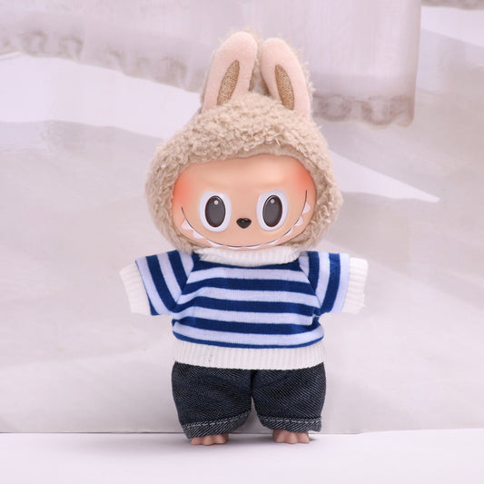 Handmade Labubu set can be paired with Labubu V1 Macaron and V2 seats 17cm pendant canvas clothing striped T-shirt+denim shorts canvas doll clothing replacement (excluding dolls)