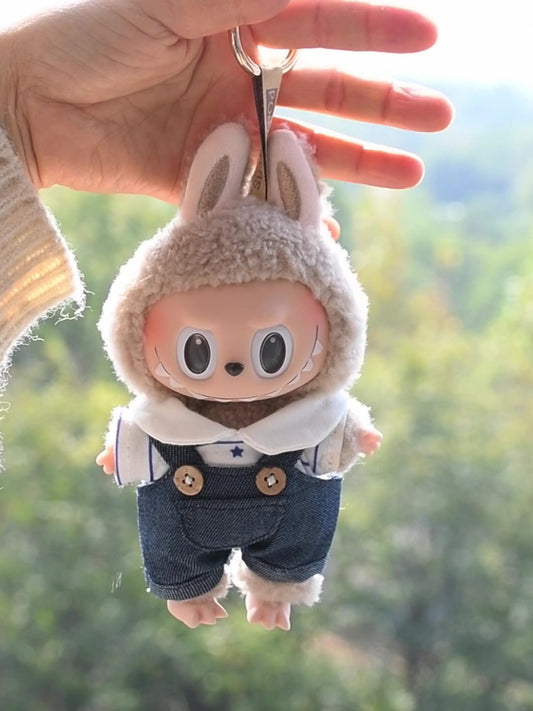 Handmade Labubu set can be paired with Labubu V1 Macaron and V2 seats 17cm pendant canvas clothing T-shirt overalls set LABUBU keychain children's clothing (excluding dolls)