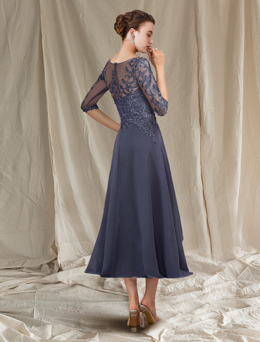 A-Line Mother of the Bride Dress Formal Elegant Scoop Neck Length Satin Lace Sleeve with Appliques