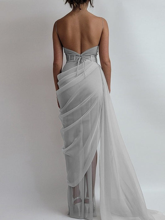 Sheath/Column Organza Ruched Spaghetti Straps Sleeveless Sweep/Brush Train Dresses