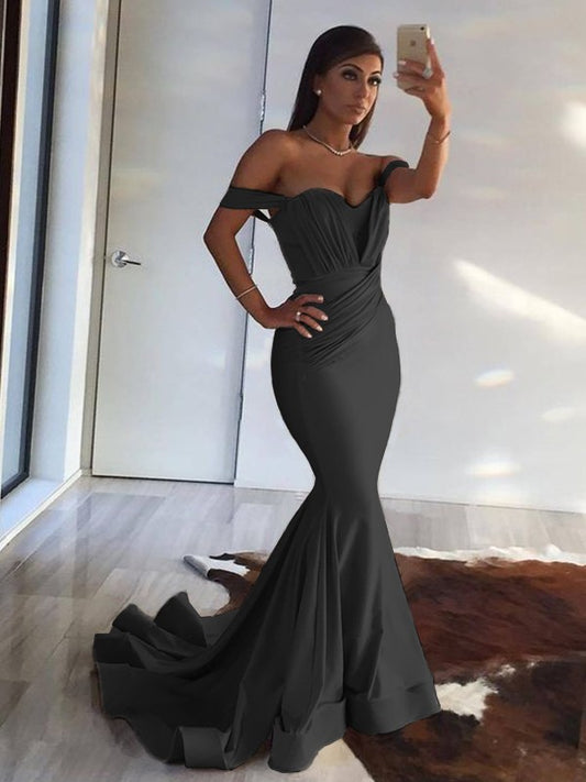 Sheath/Column Elastic Woven Satin Ruched Off-the-Shoulder Sleeveless Sweep/Brush Train Dresses
