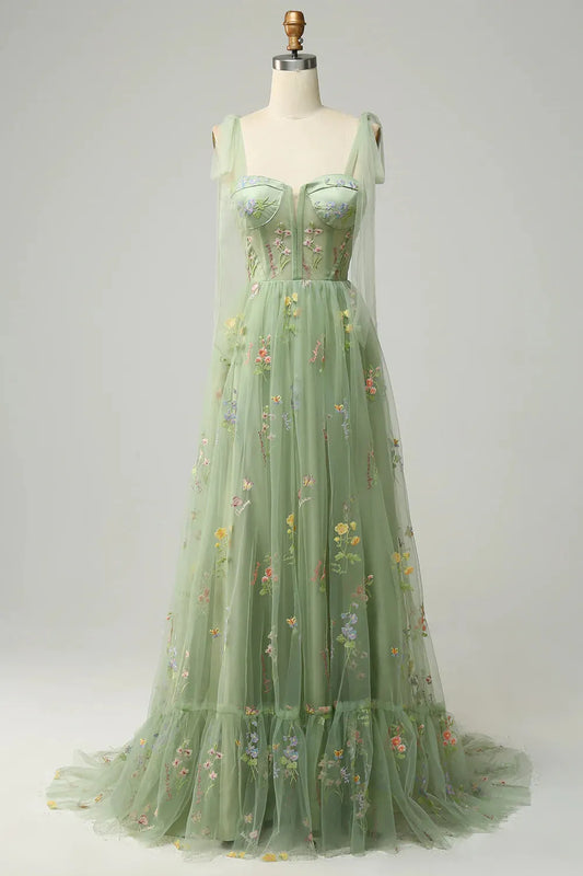 AerbaDress A-Line Tie Straps Zipper Back Long Prom Dress With Embroidery