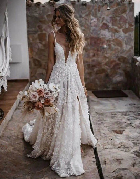 AerbaDress Wedding Dress A-Line Spaghetti Straps Lace Beach With Split
