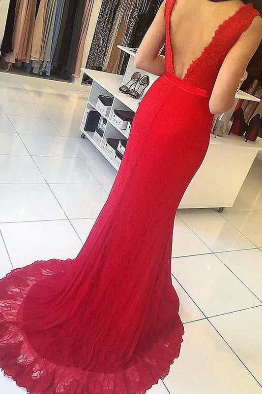 AerbaDress Prom Dresses V Neck Mermaid Lace With Sash Sweep Train
