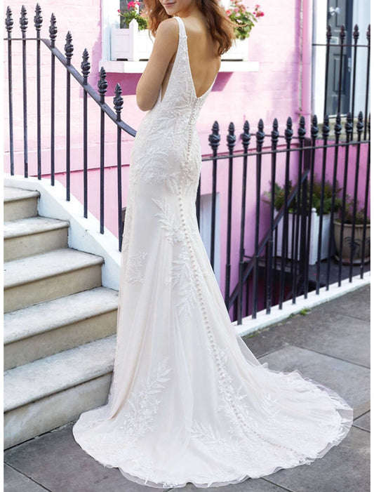 Engagement Open Back Formal Wedding Dresses Mermaid / Trumpet V Neck Sleeveless Court Train Lace Bridal Gowns With Appliques