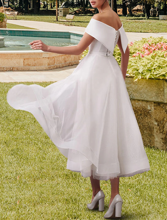 Reception Little White Dresses Wedding Dresses A-Line Off Shoulder Cap Sleeve Tea Length Satin Bridal Gowns With Sashes / Ribbons