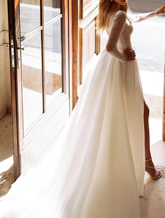Hall Sparkle & Shine Wedding Dresses A-Line V Neck Long Sleeve Court Train Satin Bridal Gowns With Split