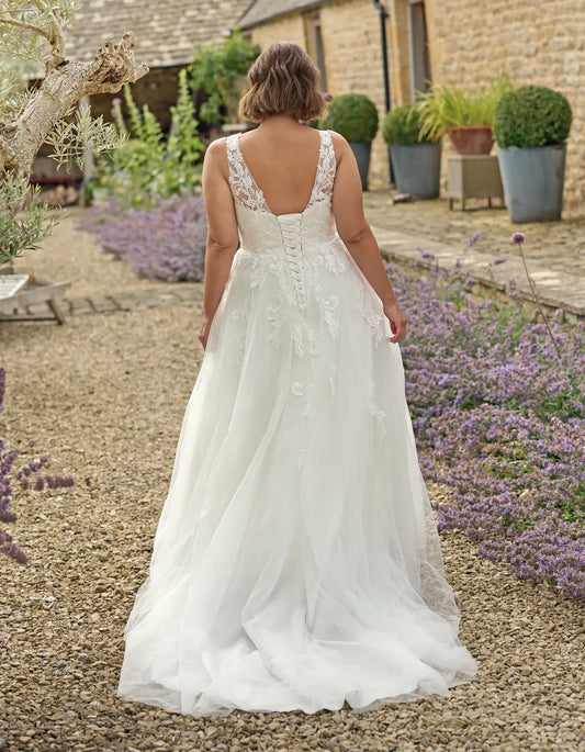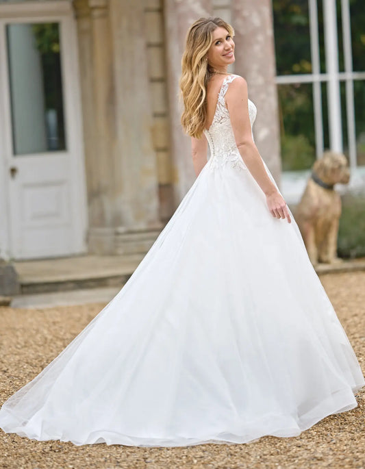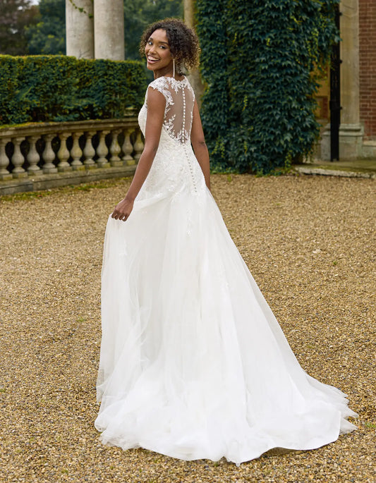a floral lace a-line wedding dress