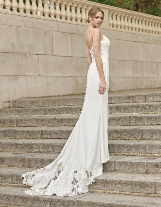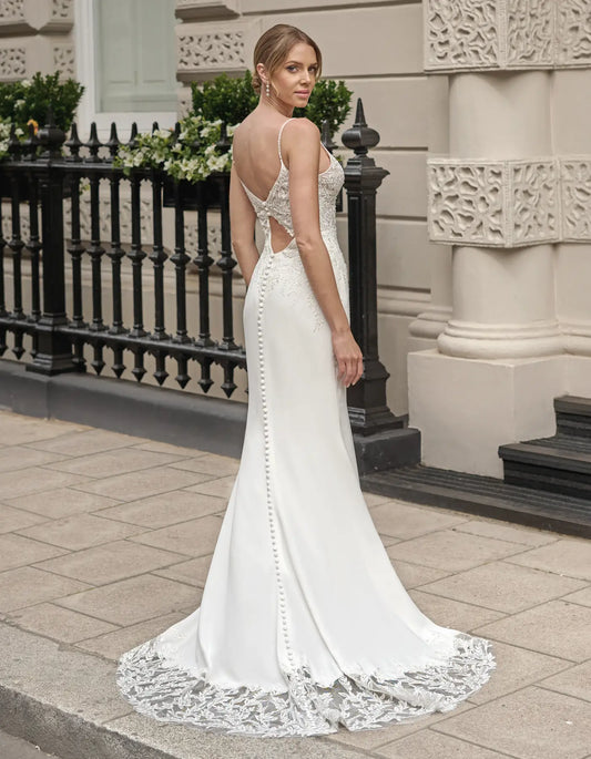a lace and crepe gown with keyhole back