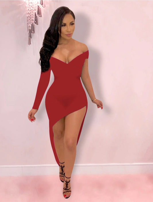 Hot Sexy Holiday Party Wear Club Dress High Slit V Neck off Shoulder Long Sleeve Bodycon Asymmetrical Spandex with Sleek