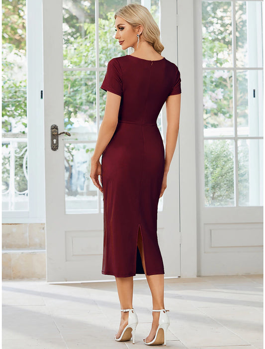 Sheath / Column Wedding Guest Dresses Minimalist Dress Party Wear Tea Length Short Sleeve V Neck Stretch Fabric with Slit Strappy