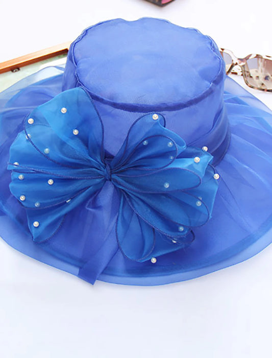AerbaDress Kentucky Derby Hat Hats Organza Bucket Hat Straw Hat Sun Hat Casual Holiday Kentucky Derby Melbourne Cup Cocktail Elegant Vintage Style With Faux Pearl Appliques Headpiece Headwear