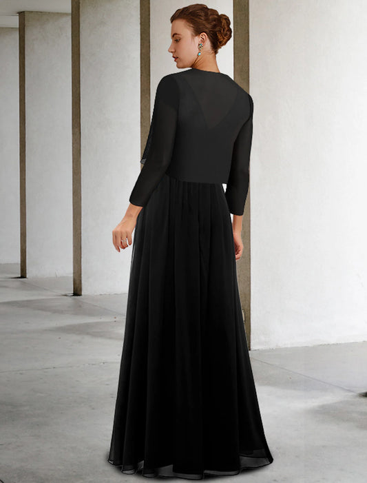 A-Line Mother of the Bride Dress Plus Size Elegant Jewel Neck Floor Length Chiffon Lace Half Sleeve with Pleats Beading Appliques