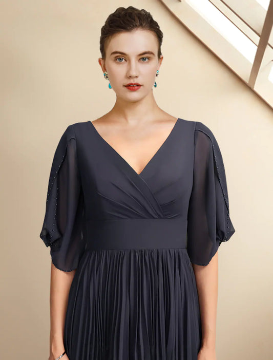 A-Line Mother of the Bride Dress Plus Size Elegant V Neck Chiffon Half Sleeve with Pleats