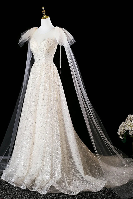 Champagne Tulle Sequins Shiny A-Line Round Neck Sleeveless With Ribbon Fashion Long Prom Dresses Formal Graduation Dress Evening Dresses
