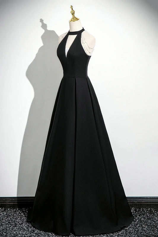Black A-Line Halter Sleeveless Bead string Pleated Backless Elegant Long Prom Dresses Formal Graduation Dress Evening Dresses