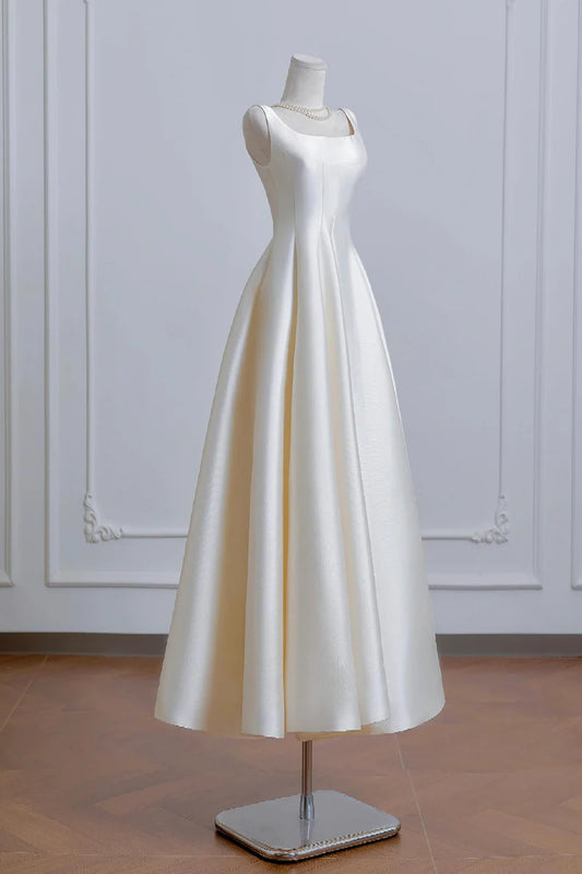 Simple White Satin A-Line Square Neck Sleeveless Ruched Hem Elegant Beautiful Long Prom Dresses Formal Graduation Dress Evening Dresses