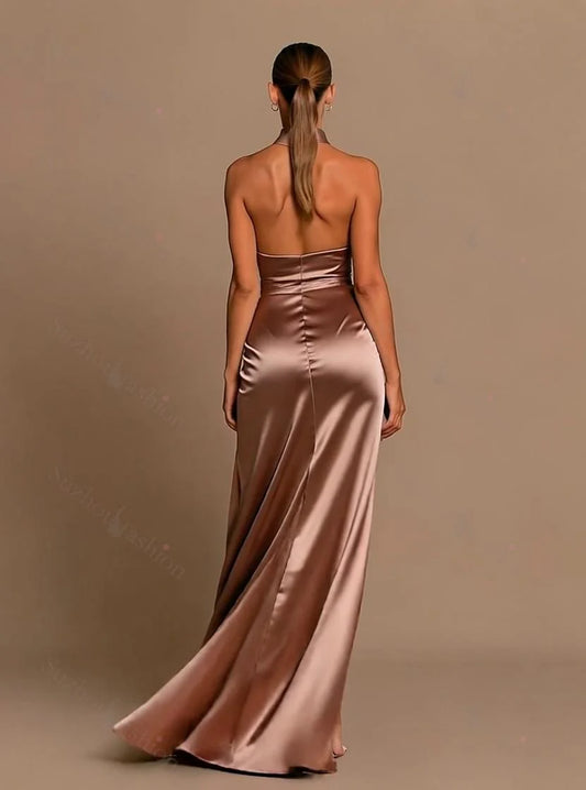 Glamorous Sheath Halter Ruched Rose Gold Floor-Length Prom Dress