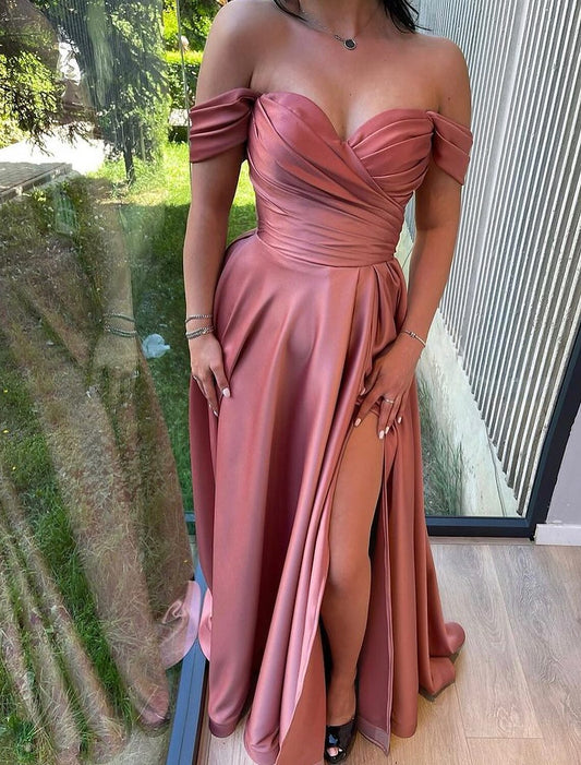 A-Line Prom Dresses High Split Dress Wedding Guest Formal Evening Sweep / Brush Train Short Sleeve Off Shoulder Satin with Slit Pure Color