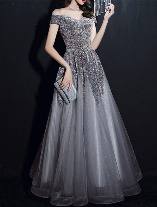 A-Line Prom Dresses Sparkle & Shine Dress Formal Wedding Guest Floor Length Short Sleeve Off Shoulder Polyester with Sequin