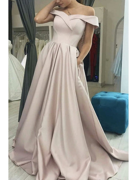 A-Line Prom Dresses Minimalist Dress Formal Wedding Guest Floor Length Sleeveless Off Shoulder Pocket Stretch Satin Backless with Pleats Pocket