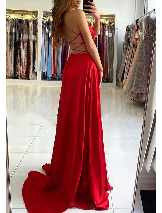 A-Line Prom Dresses Open Back Dress Formal Wedding Party Sweep / Brush Train Sleeveless Spaghetti Strap Satin Backless with Pleats