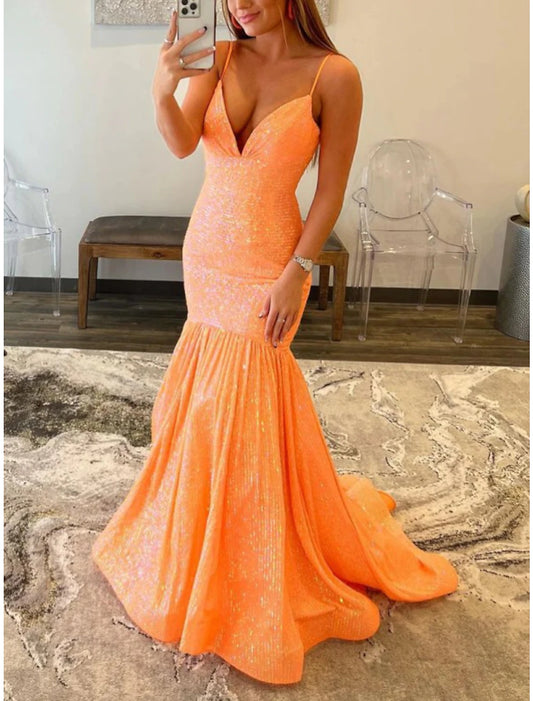 Mermaid / Trumpet Prom Dresses Sparkle & Shine Dress Wedding Party Sweep / Brush Train Sleeveless Spaghetti Strap African American Sequined with Glitter Ruched