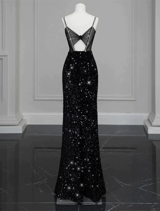 A-Line Little Black Dress Dress Party Wear Floor Length Sleeveless Silk Backless with Crystals Sequin