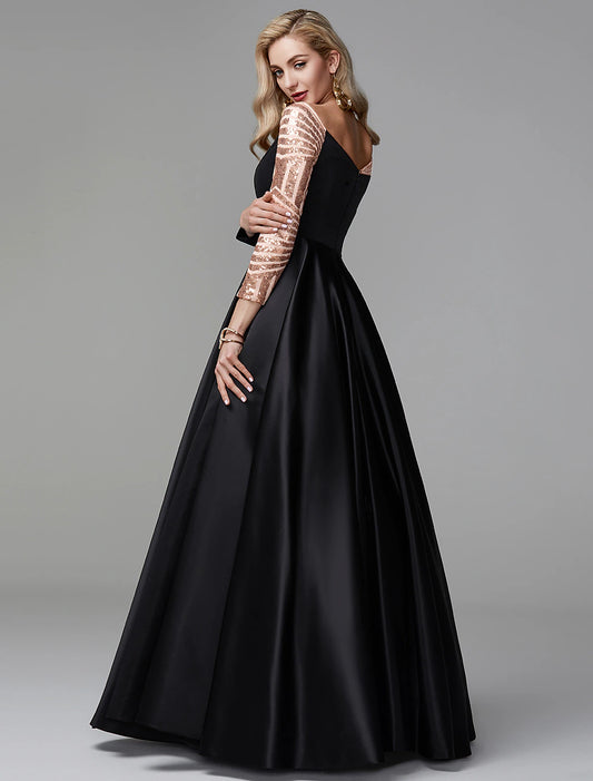 Ball Gown Sparkle Quinceanera Formal Evening Dress Off Shoulder Long Sleeve Floor Length Satin with Sequin