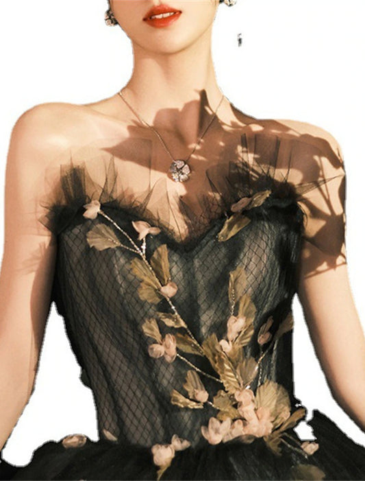 A-Line Prom Dresses Floral Dress Masquerade Ankle Length Sleeveless Strapless Tulle Backless with Floral