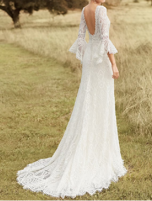 Engagement Open Back Sexy Formal Wedding Dresses Court Train A-Line Regular Straps V Neck Lace With